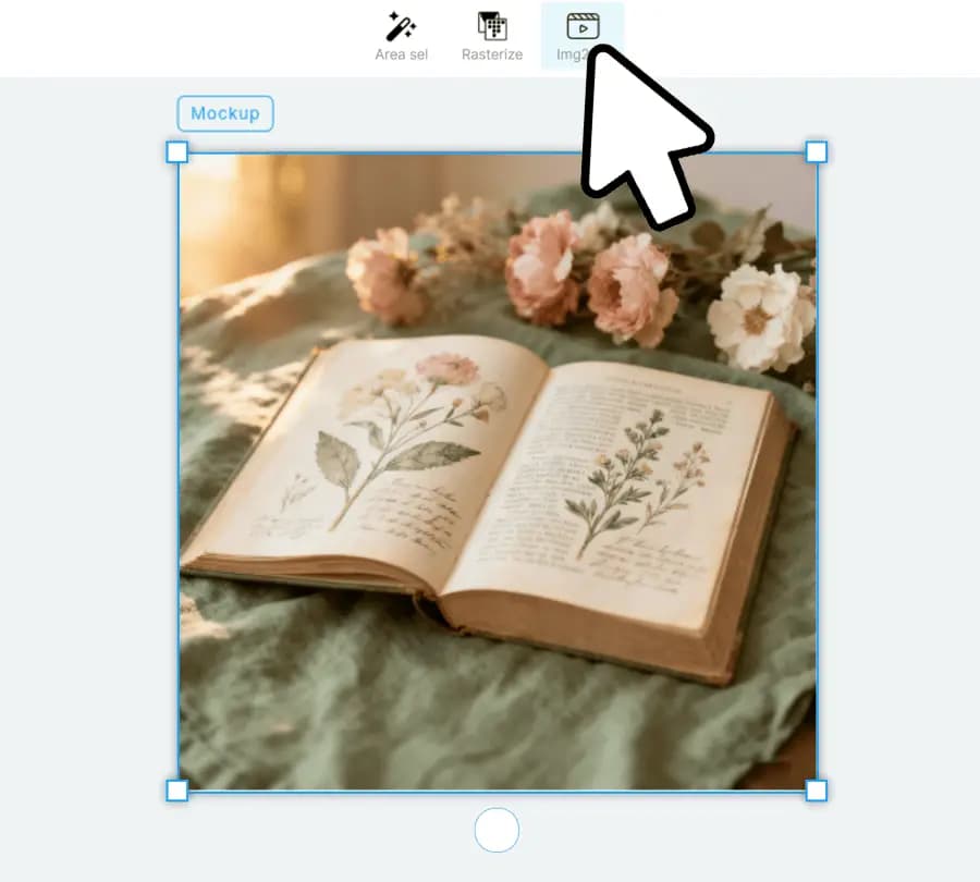 Once your book cover or spread mockup is ready in Mockuplabs, click it on the canvas to open the image‑to‑video generation panel.