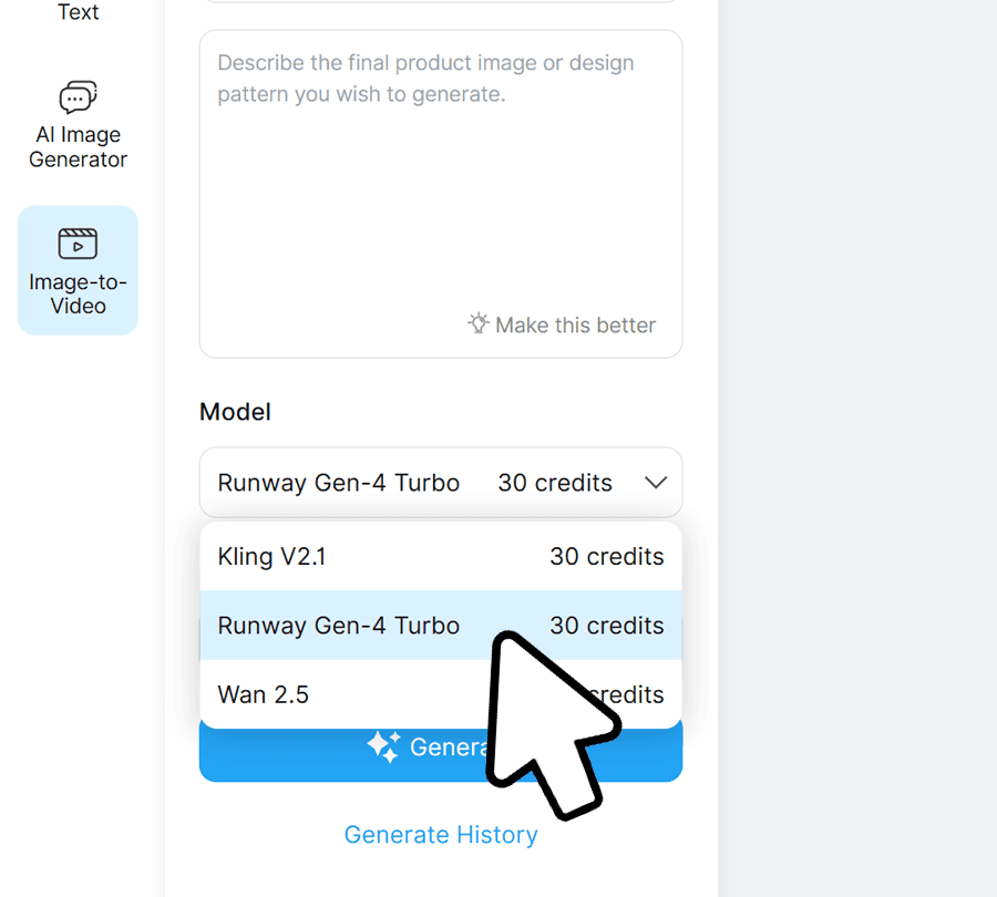 Pick from available AI models — Kling or Runway are recommended for smooth page‑turns and realistic lighting.