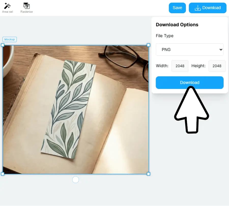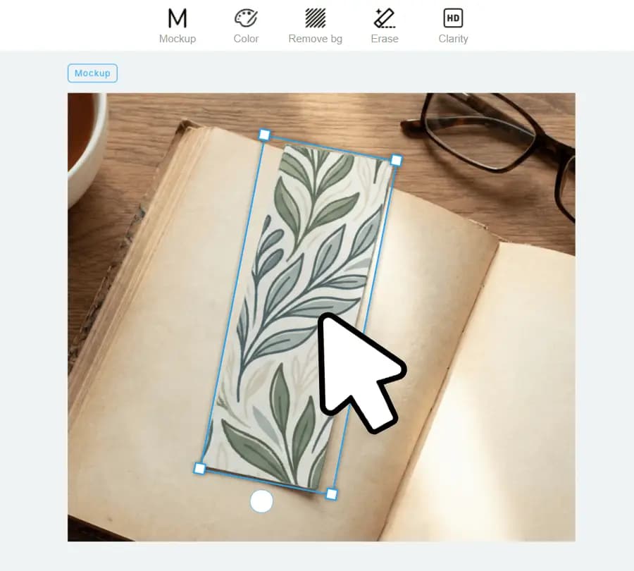 To apply design, simply drop in both your bookmark image and a design image file, convert bookmark image to a mockup, then drag designs and text onto the mockup.