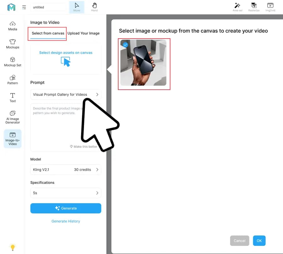 After completing iPhone mockup design in Mockuplabs, select the finished mockup directly on the canvas to start creating video mockup.