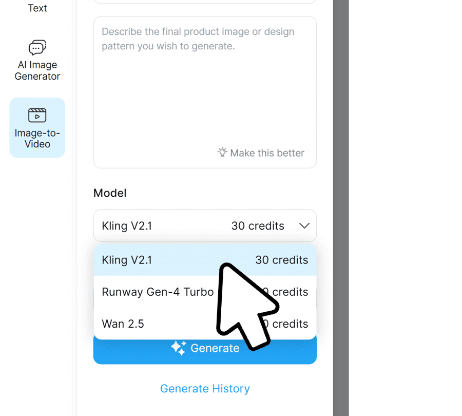 Select the most suitable image-to-video model from the list. We recommend Kling for cinematic iPhone motion effects.