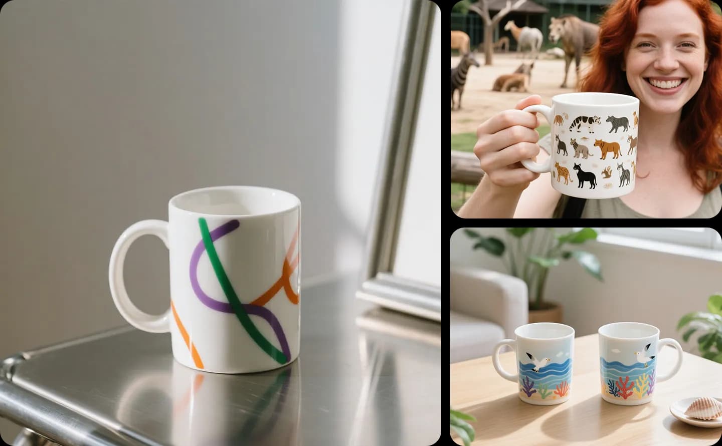 Adjust mug color, background, and orientation to align with your brand's aesthetic. Remove backgrounds for clean, transparent visuals or choose contextual settings like coffee tables, desk scenes, or outdoor moments. Generate design variations, apply seasonal themes, and maintain cohesive visuals across ad sets, websites, and email campaigns.