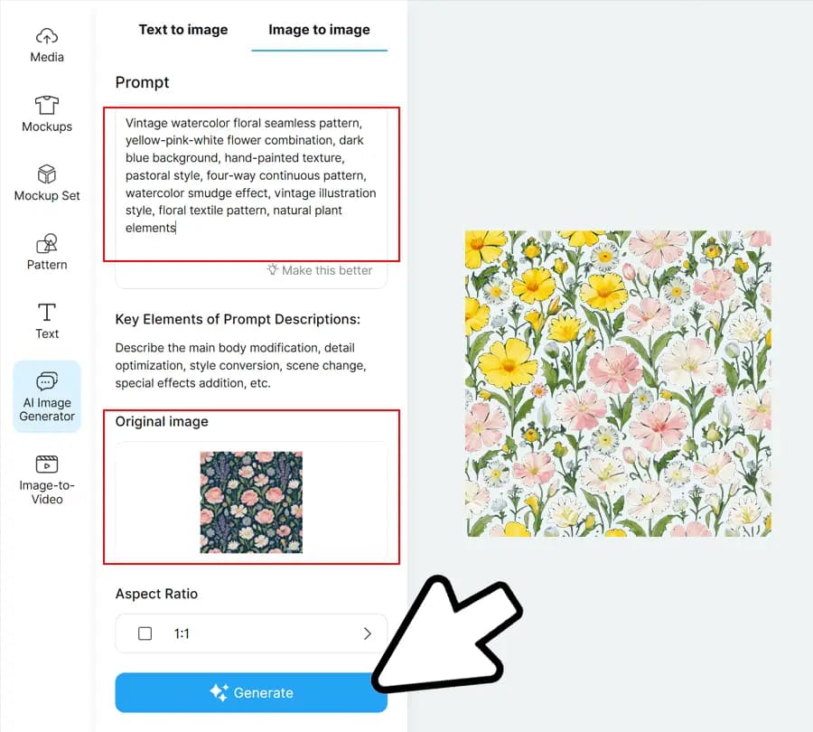 You can select the "AI Image Generator" in Mockuplabs.ai, upload your sketch or describe your idea (e.g., "vintage floral repeat"), generator, then download the pattern for free.