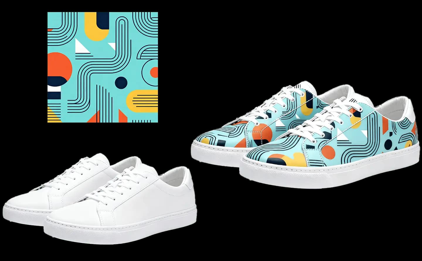 Drag your design onto the shoe mockup or browse the in-app design library for textures, patterns, and materials to customize your shoe mockup.