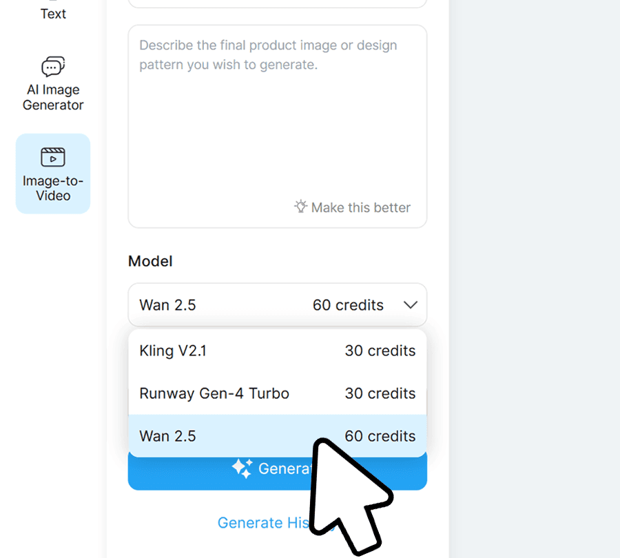 Select a model for animation. For realistic fabric movement, we recommend Runway, or use Wan for stylized motion.