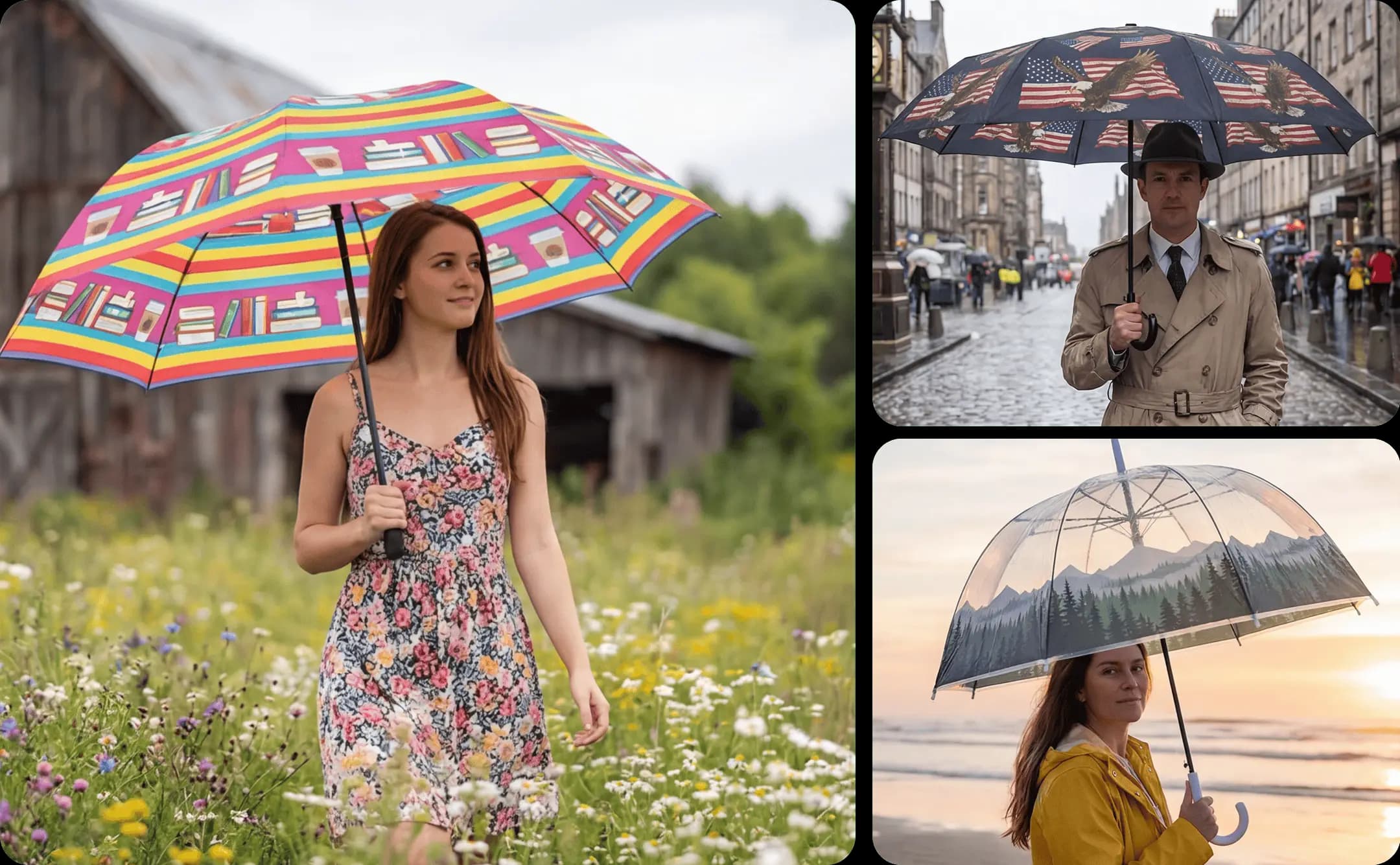 Apply patterns or graphics across the entire umbrella surface.![]()